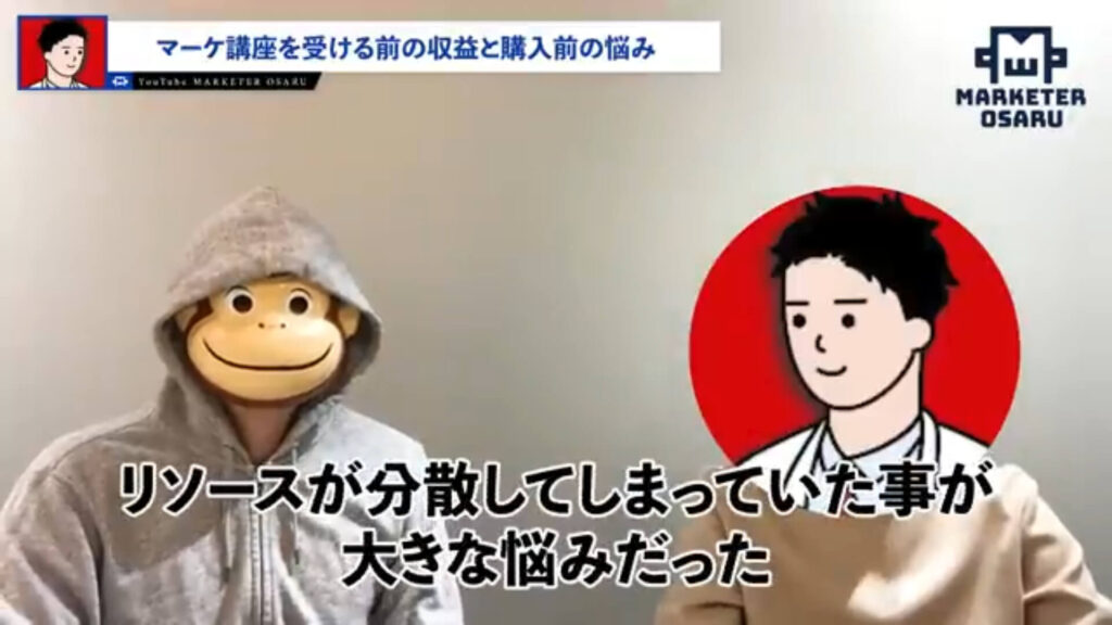 おさる:早速、質問1つ目に入っていきます。僕の講座を受ける前はどれくらいの収益だったのか、またそのときの悩みなど教えていただけますか?