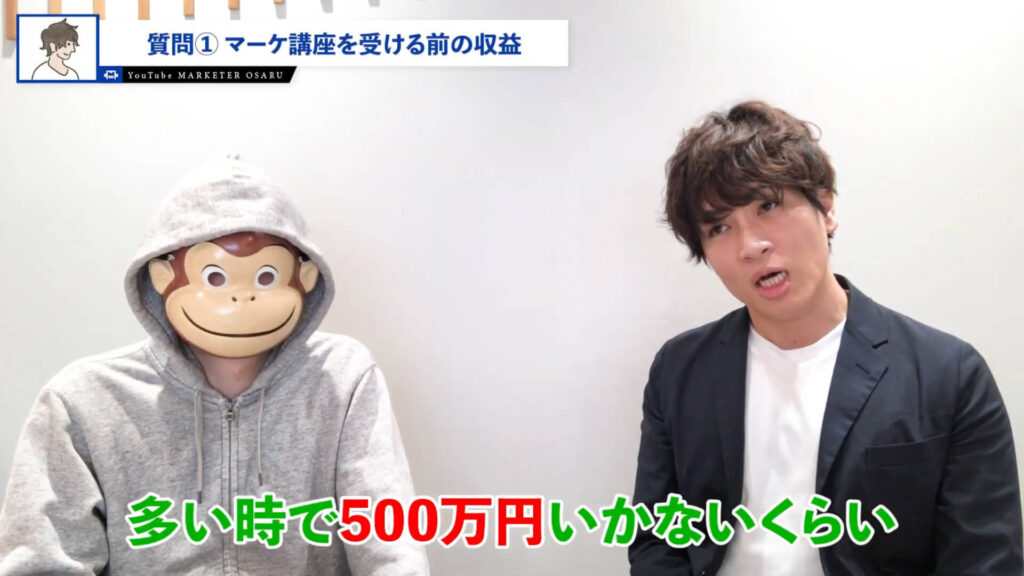 おさる:先ほどちょっと僕も軽く触れましたけど、僕のマーケティングの講座に入る前は実際にどれくらいの収益だったんですか?