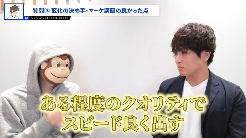おさる:ここが皆さん聞きたいと思うんですけど、変化の決め手となったものや結局僕の講座の何が良かったのかということですね。この短期間で売り上げた秘密があったということでいかがですか?
