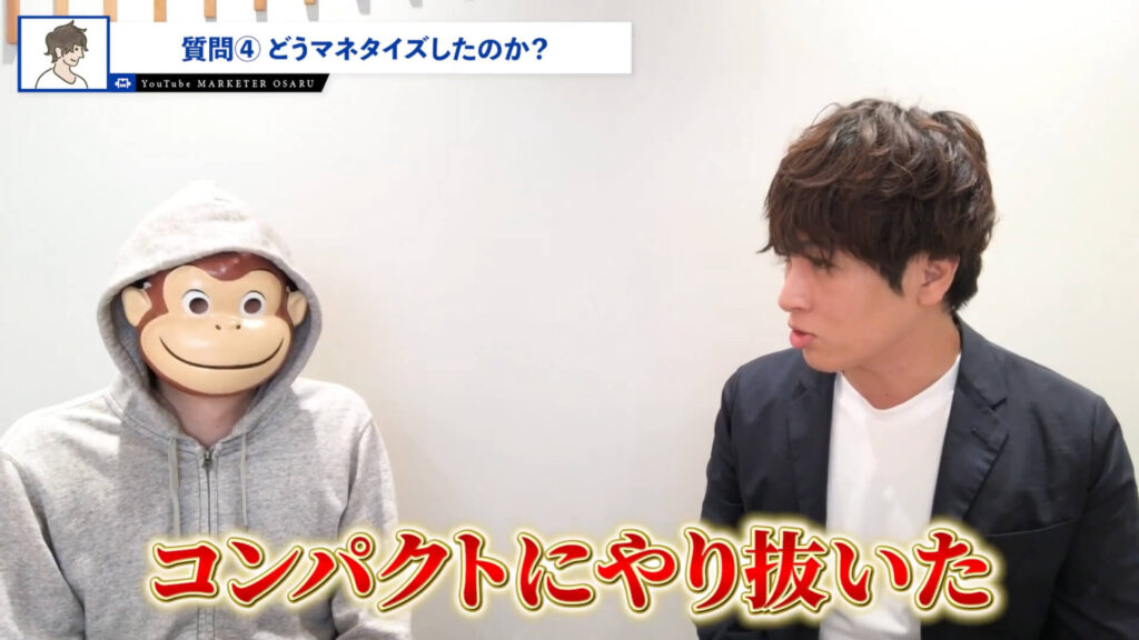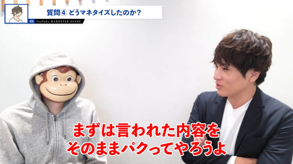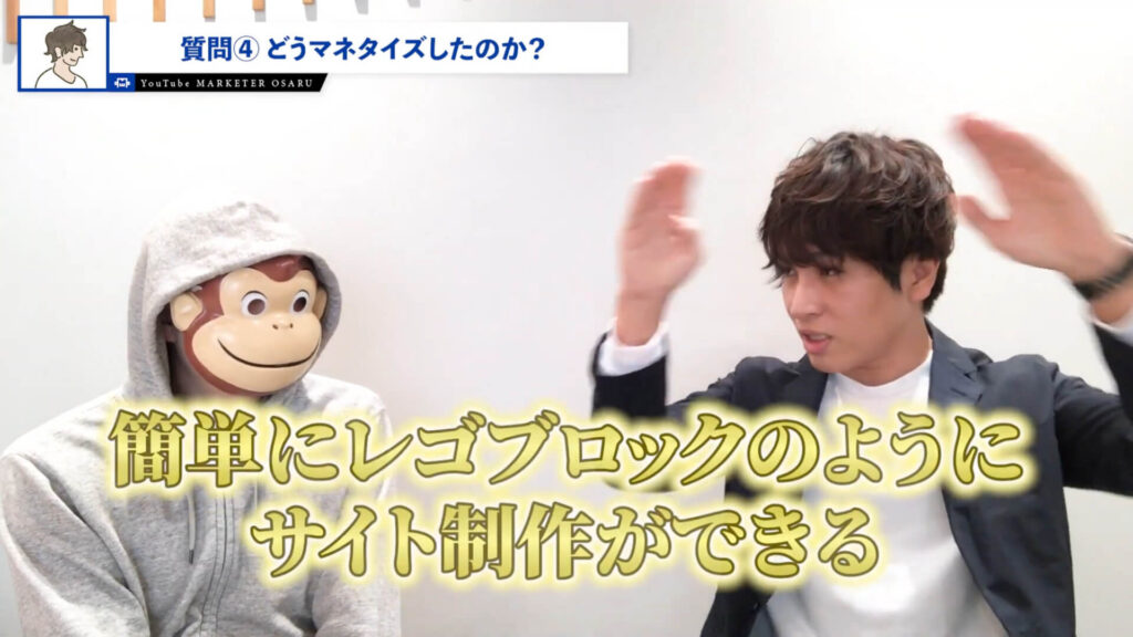 おさる:次にどうマネタイズしたのか教えてください。僕はローンチ動画というものも教えてるんですけど、それもほぼ使ってないということで再現性があると思っていて、SNSとかを持ってる方はすぐにサイトを作ってセミナーをやって僕のセミナー資料も使っていただいてすぐ売る。そういうふうにやっていただければいいわけですけど、どうやってマネタイズをしたのかをまた教えていただいてもいいですか?