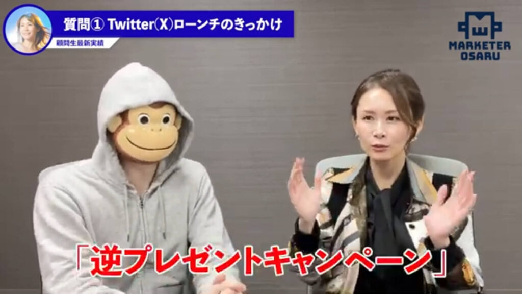 そのTwitter(X)を動かしたいなって思ったときに、1つキャンペーンをやりたいと思いました。ただTwitter(X)の文化もわからないし、キャンペーンの方法もわからない。おさるさんはYouTubeもそうですけれどTwitter(X)もフル活用されていて、戦略としても多くの実績も持っているので相談させていただいたきました。