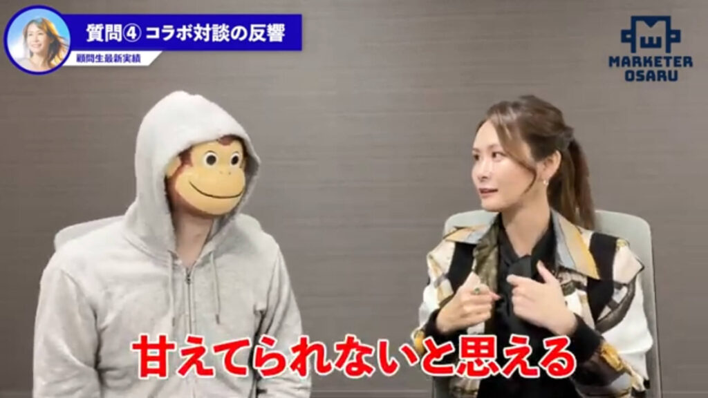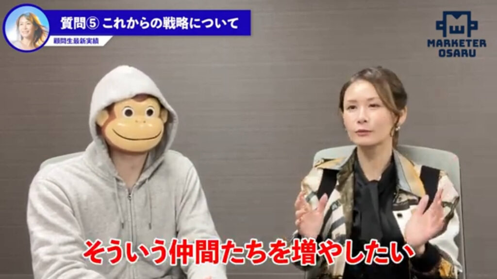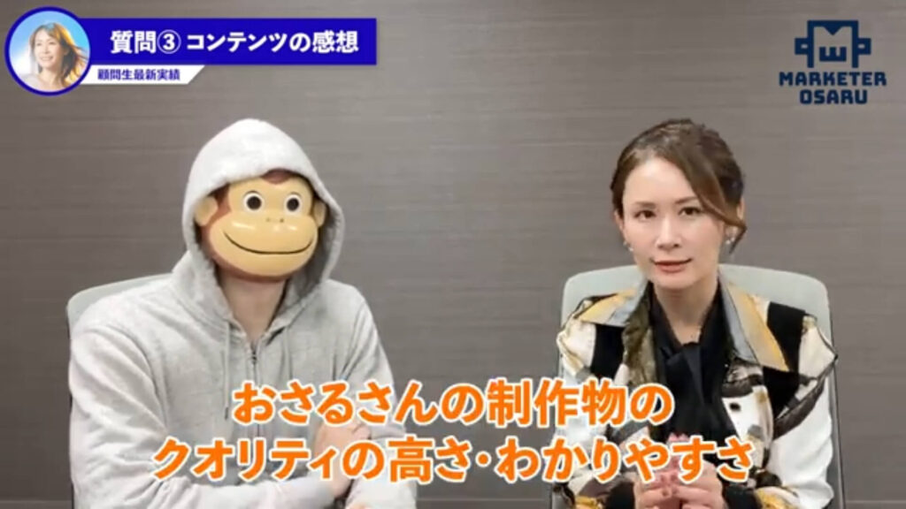 おさる:僕のサポートの雰囲気とか、いろいろと話していただきました。僕の顧問のサポートを受けるときにコンテンツも渡させていただきましたが、ぶっちゃけ見た感じどういう感想を抱かれましたか?もちろんスタッフの方も見ていただいたと思いますが、そのあたりはいかがでした?