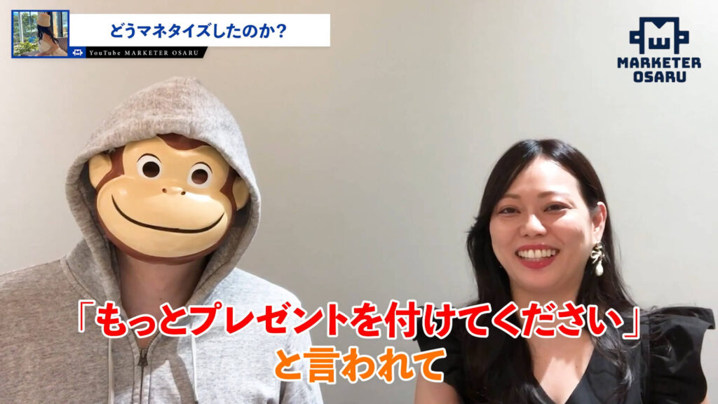 キャン:ですので、全部1人でやっていてしかも億を超えている人を探していたら、突然おさるさんが現れたんです。この人しかいないって、ピンときました。