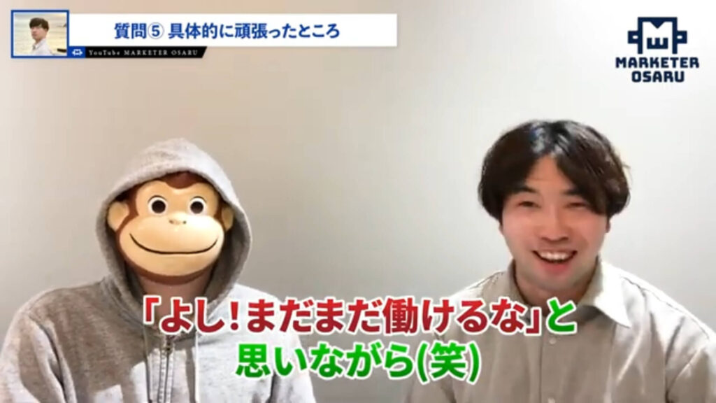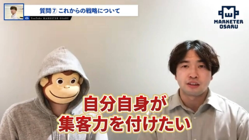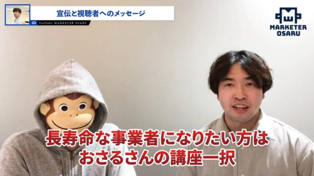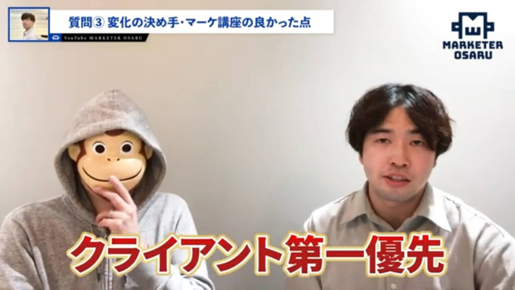 自分の中で衝撃が走ったというところがありまして「より自分のマーケティングスキルを向上させていきたい」「クライアントをもっと勝たせていきたい」と考えたときにおさるさんの講座一択だなというところで僕も、まわりの方たちが対談動画に出ているのを見て決断に至りました。