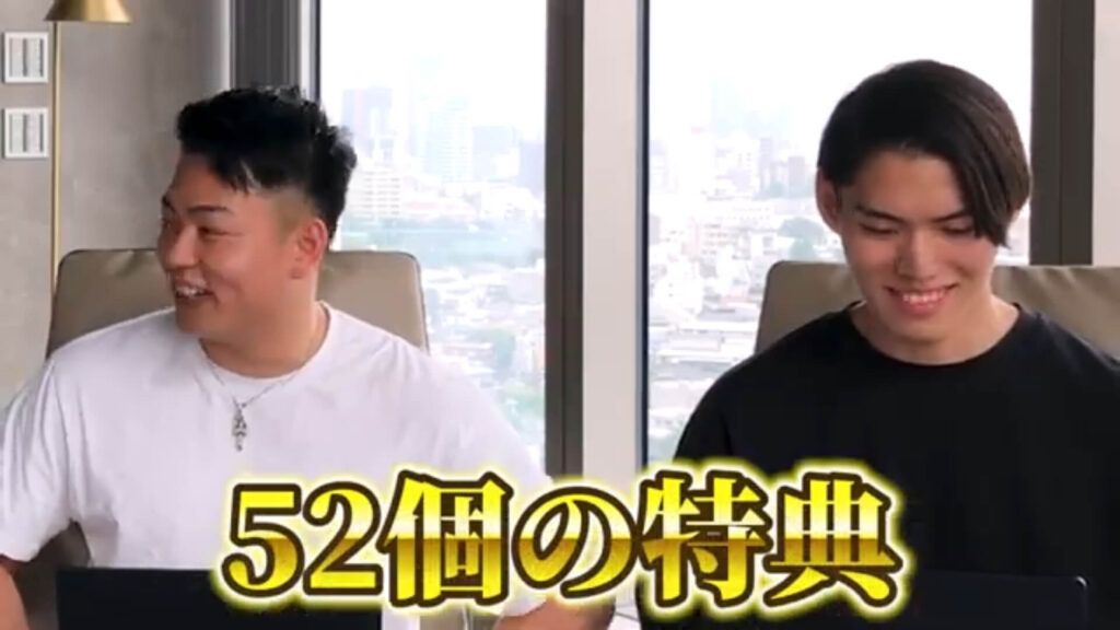 おさる:本当に有益だから無料だけでも成果を出せる。またそのお客さんが「もっと学びたい」と思ってくれたりとかね、良いことづくしです。無料で貰うのはリスクないですからね。この特典が合計52個あって、登録するだけで38個。ぜひ学んで欲しくて。