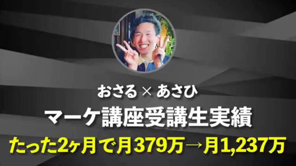 あさひ:ほかのインスタマーケターの方々、例えば『たくむさん』や『はっぴーさん』など僕が見ていた方々が全員おさるさんの講座を受けていて、それで成果を出されて月1,000万円を達成されていたり「僕だけ置いていかれるわけにはいかない!」と思って途中入会させていただきました。