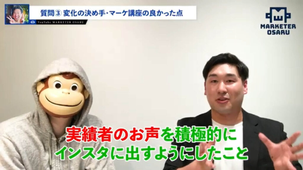 あさひ:おさるさんの「実績のお声の重要性」というところがすごく響いてですね、そこの重要性があまりわかっていなかったのが正直なところで、自分の発信や自分の価値観だけ出していれば良いのではないかと思っていたところを、ここが大事というセンターピンを教えてもらってそれですぐに実行しましたね。