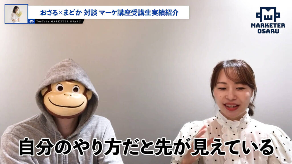 まどか:はい。いろいろなマーケティング手法やセールスを学んでも、うまく結果に繋がらないって悩んでいる方も多くいらっしゃると思います。そんな方にはぜひ、おさるさんの講座をおすすめしたいです。
