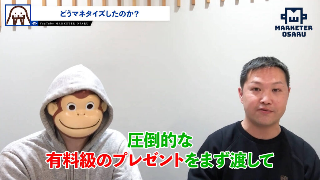 おさる:普通は売る前にみんな頑張りますよね。でも、販売したあとにお客様に満足してもらうようなコンテンツをやることで口コミが回ります。多くの人は時間差で来るメリットにコミットできません。当たり前ですが、どうせやるなら短期的に1か月で成果が出るものだけに集中したいと思うものです。