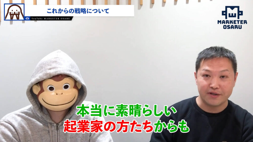 セイウチ:例えば、YouTubeは講座のセンターピンとして流れている1つです。おさるさんの受講生は約900人という大勢の方がいますが、その900人は「YouTube始めました」というレベルの方ではなく、各SNS業界のトップインフルエンサーが根こそぎ入っています。メンバーを見たときとても驚きました。知らない人はいないという方が大勢おられます。