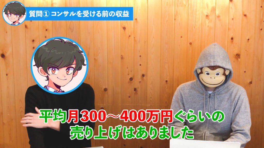 おさる:早速なんですけれども聞いていきたいところとしては、僕のコンサル受ける前はどれくらいの収益だったかっていうところです。そのほか何に課題を感じてたかみたいなところもありましたらお願いします。