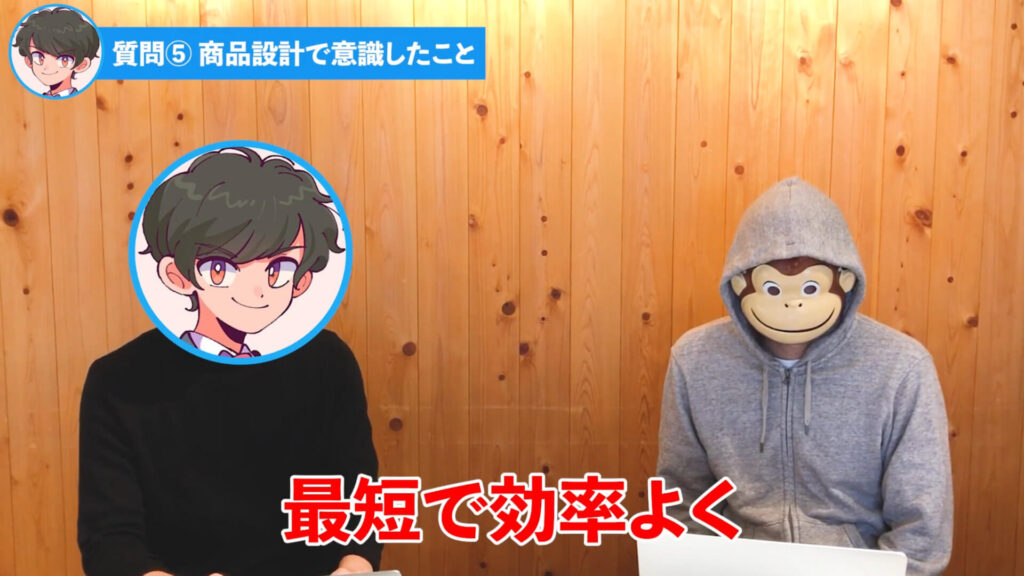 おさる:質問5つ目です。実際に商品をもちろん売られてきたと思うんですけど、商品設計においては、何を意識されてきたのかを教えていただいてもいいでしょうか。