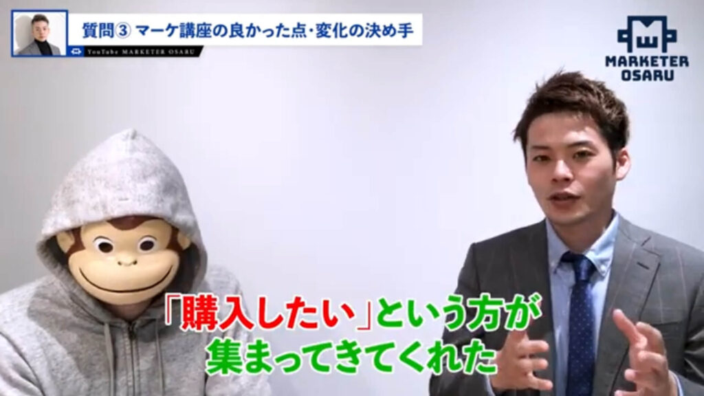 おさる:では質問1個目です。僕のマーケティング講座を受ける前の収益や購入前の悩みを教えて頂けますか?