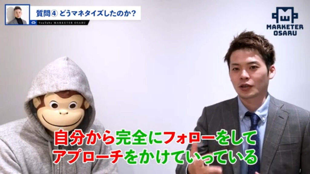 おさる:アウトバウンド集客じゃないんですが、DMで直接セールスをするのではなくて、まずはフォローをして、そこからは自分のフォロワーを増やして、セミナーを開いて購入に繋がったということですね。