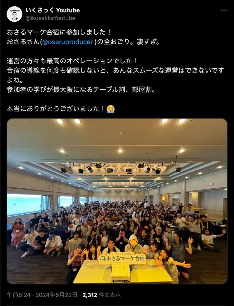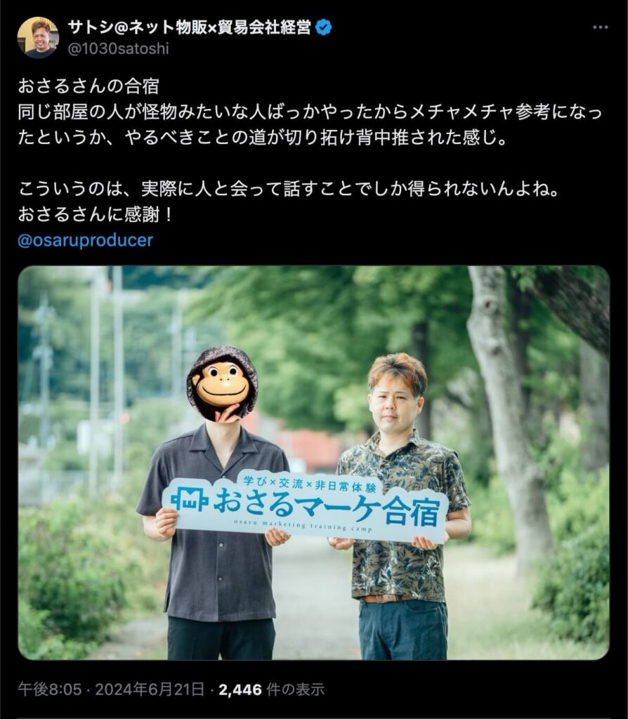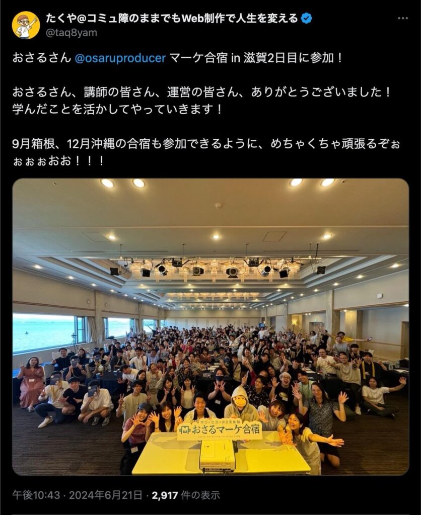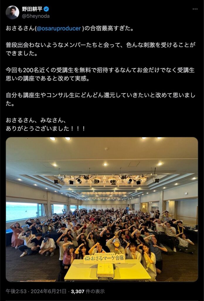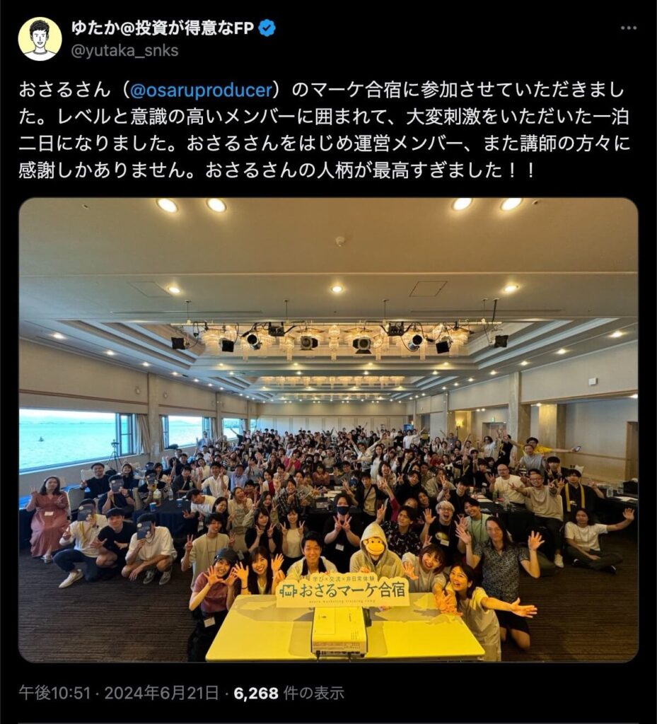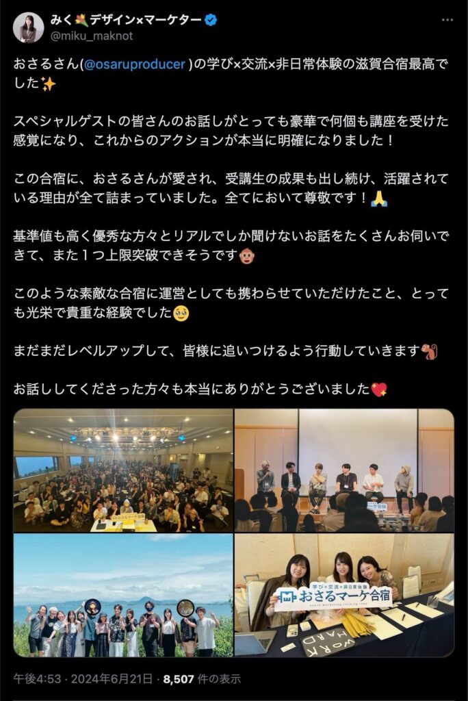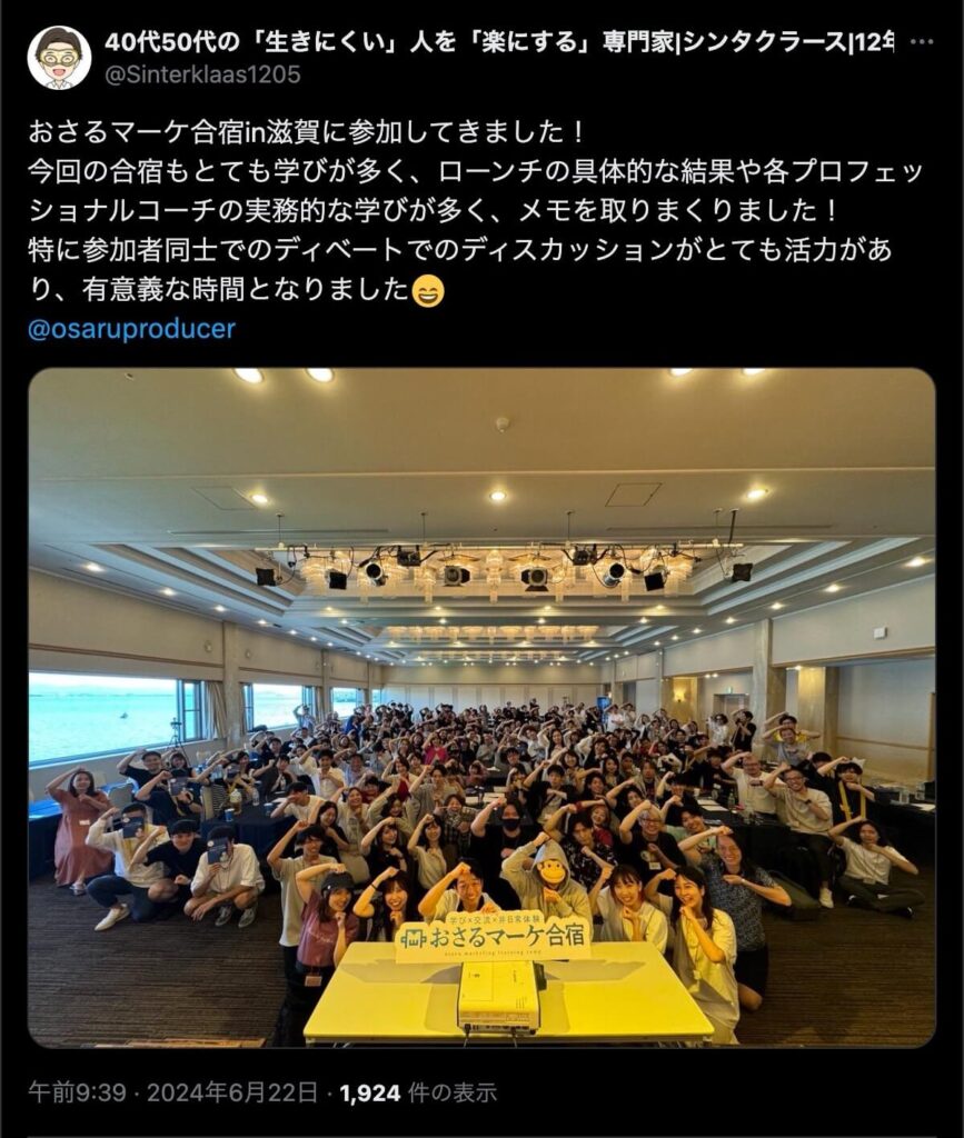 2024年6月20日、総合マーケ講座のおさるマーケ合宿が開催されました。今回も素晴らしい熱量を持った受講生と、運営スタッフによって大成功となりました。