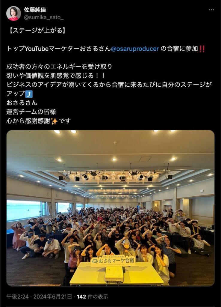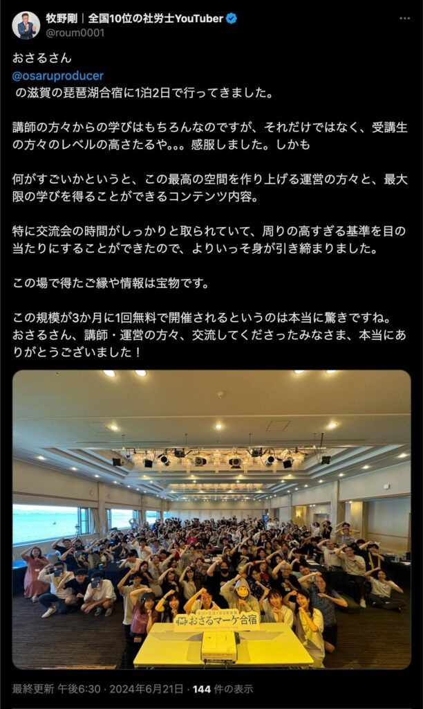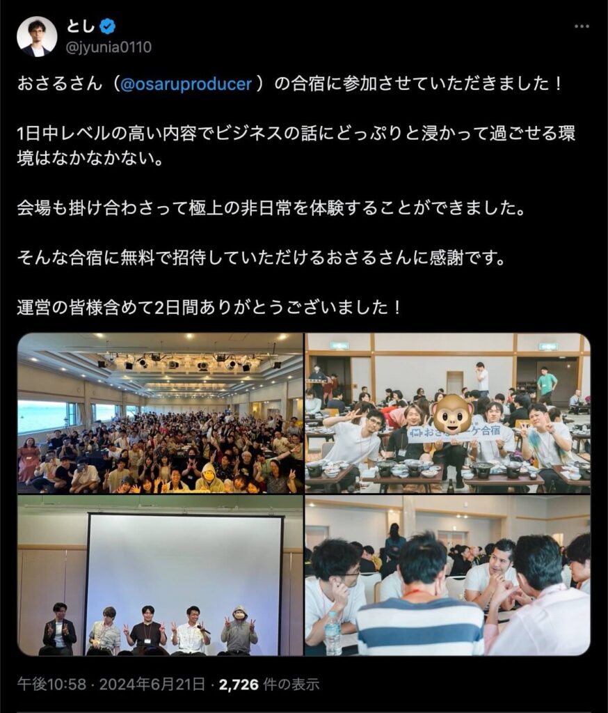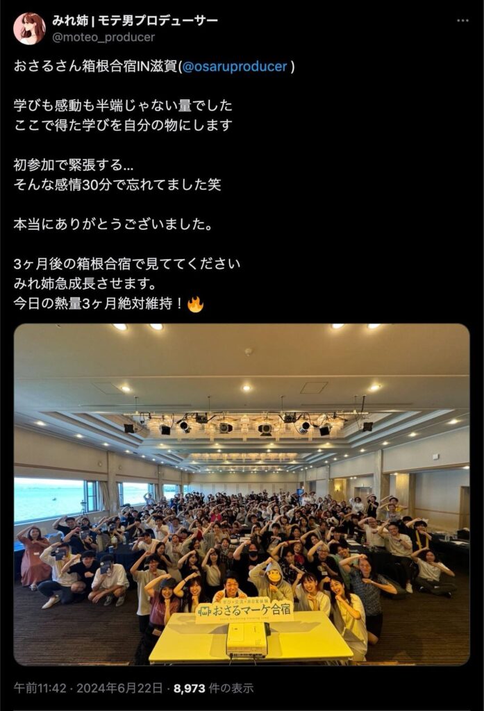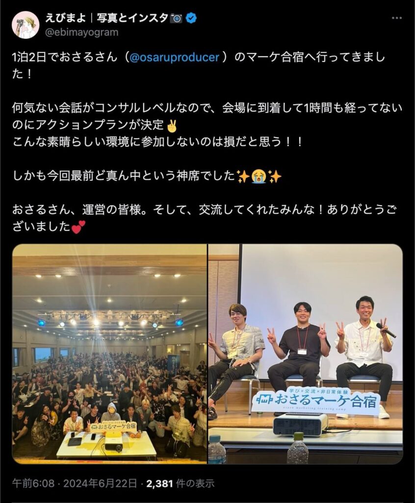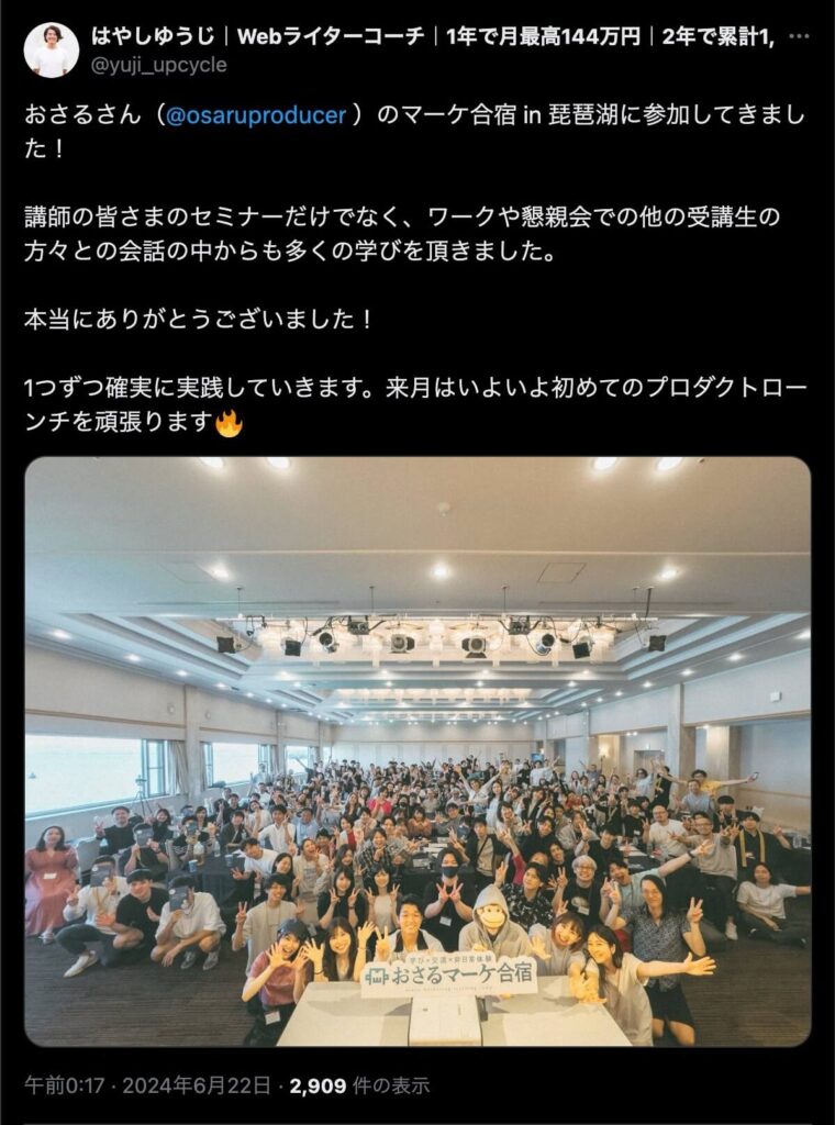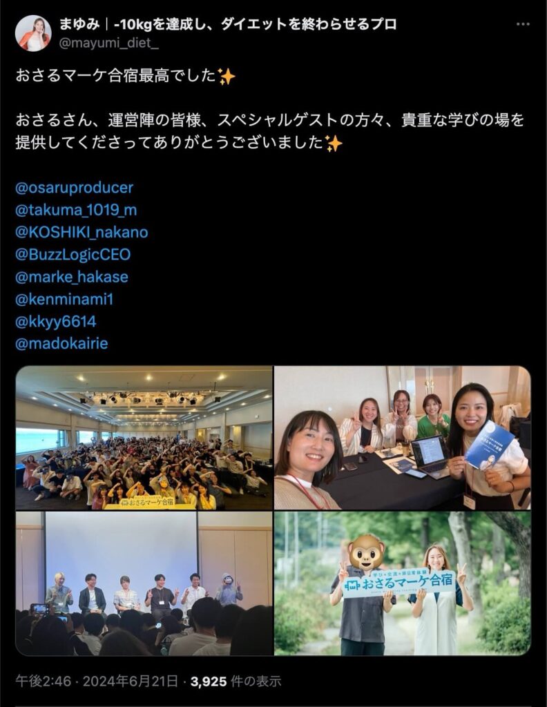 2024年6月20日、総合マーケ講座のおさるマーケ合宿が開催されました。今回も素晴らしい熱量を持った受講生と、運営スタッフによって大成功となりました。