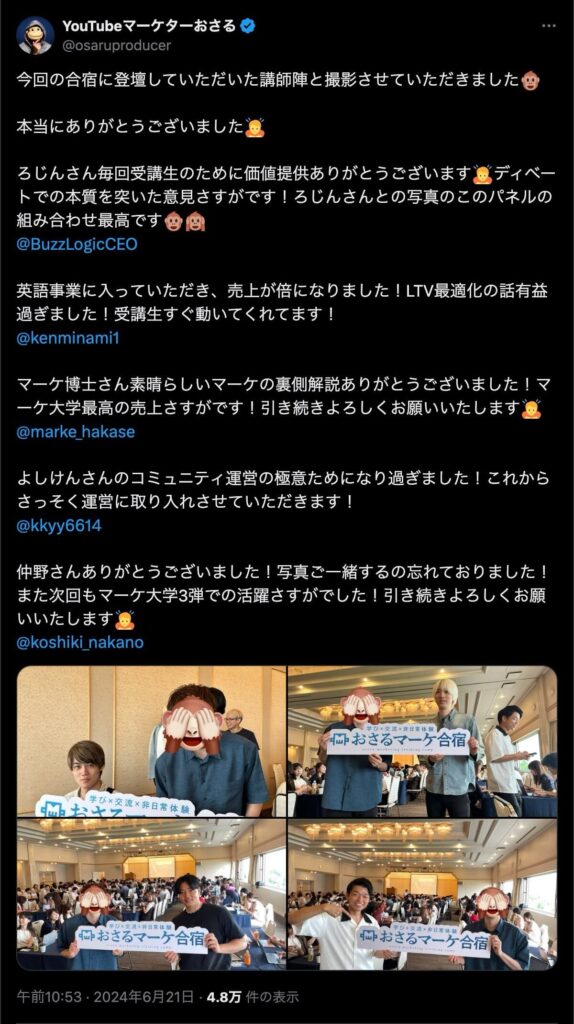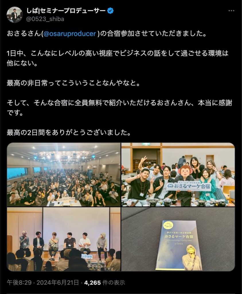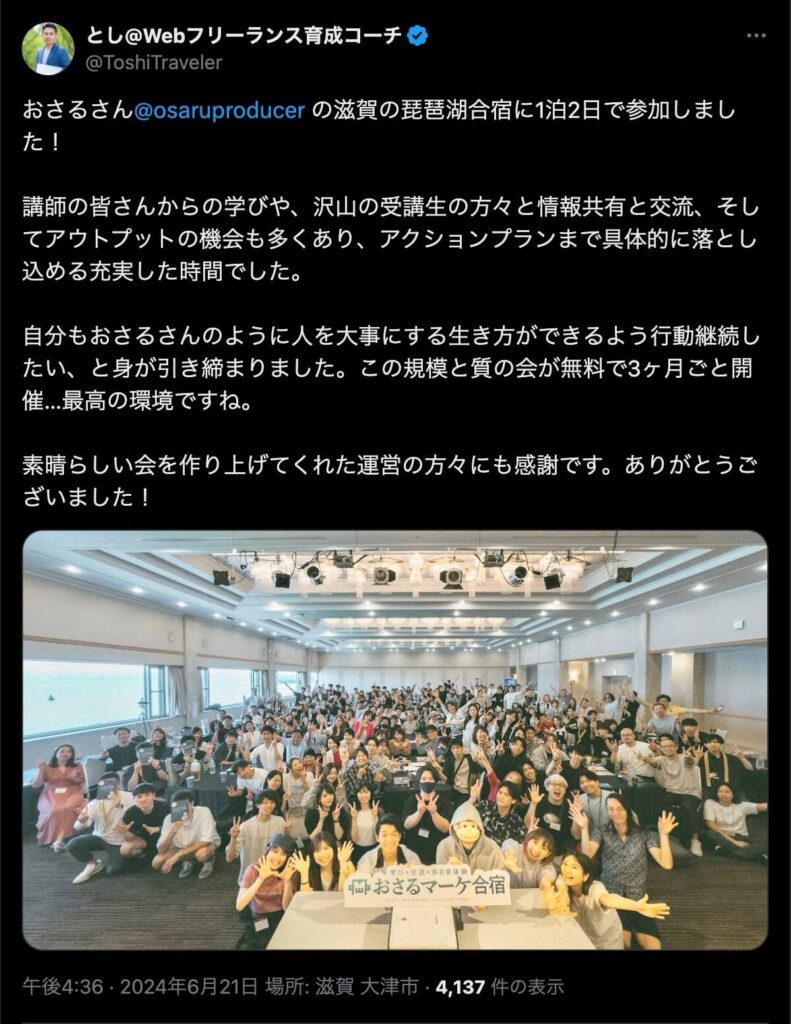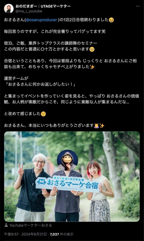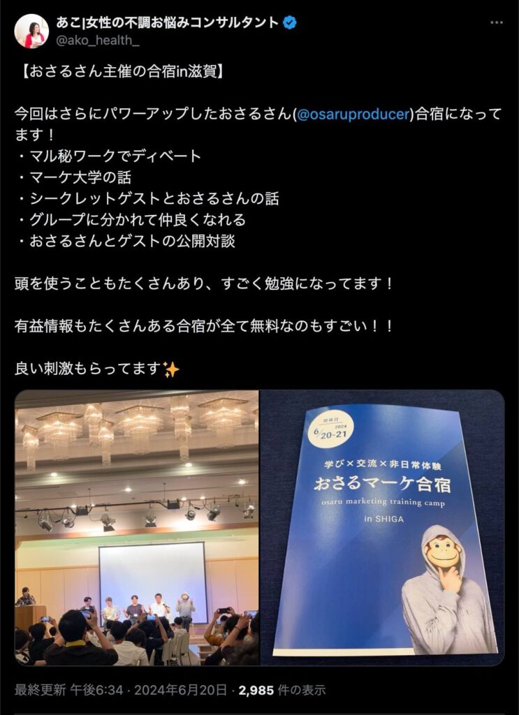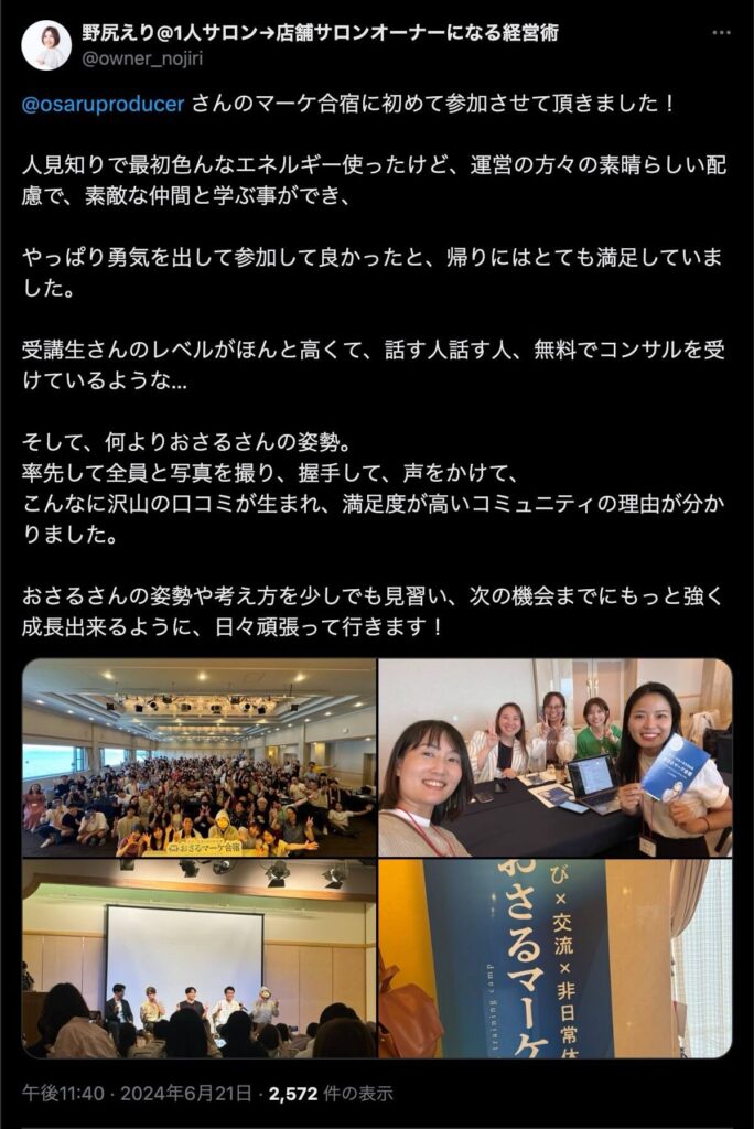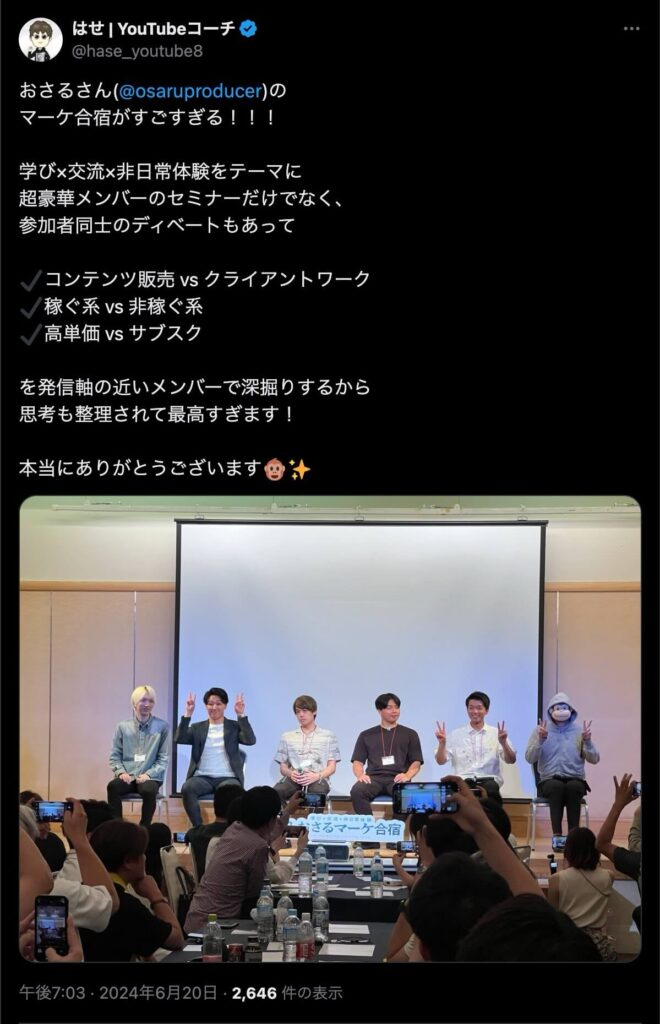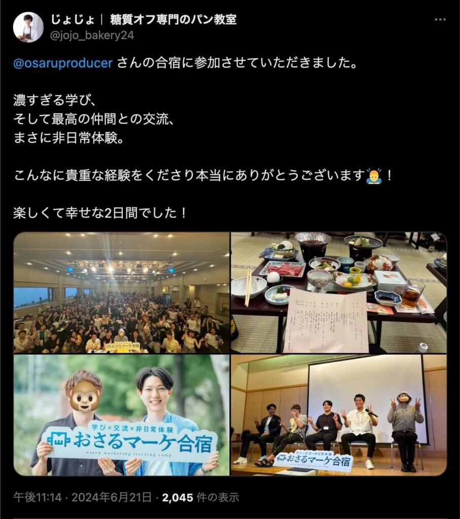 2024年6月20日、総合マーケ講座のおさるマーケ合宿が開催されました。今回も素晴らしい熱量を持った受講生と、運営スタッフによって大成功となりました。