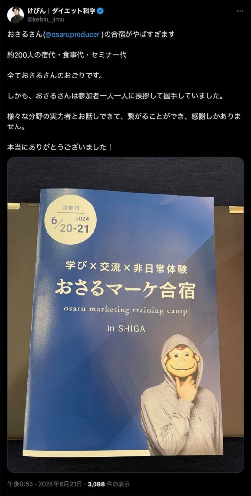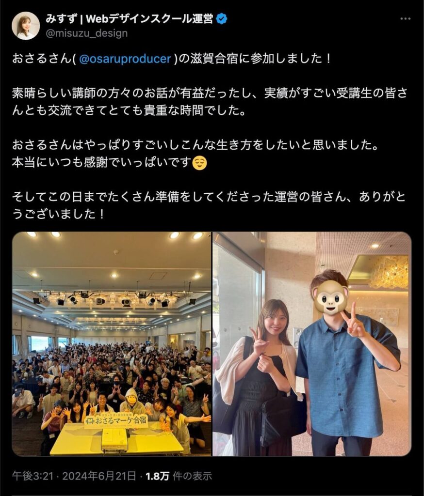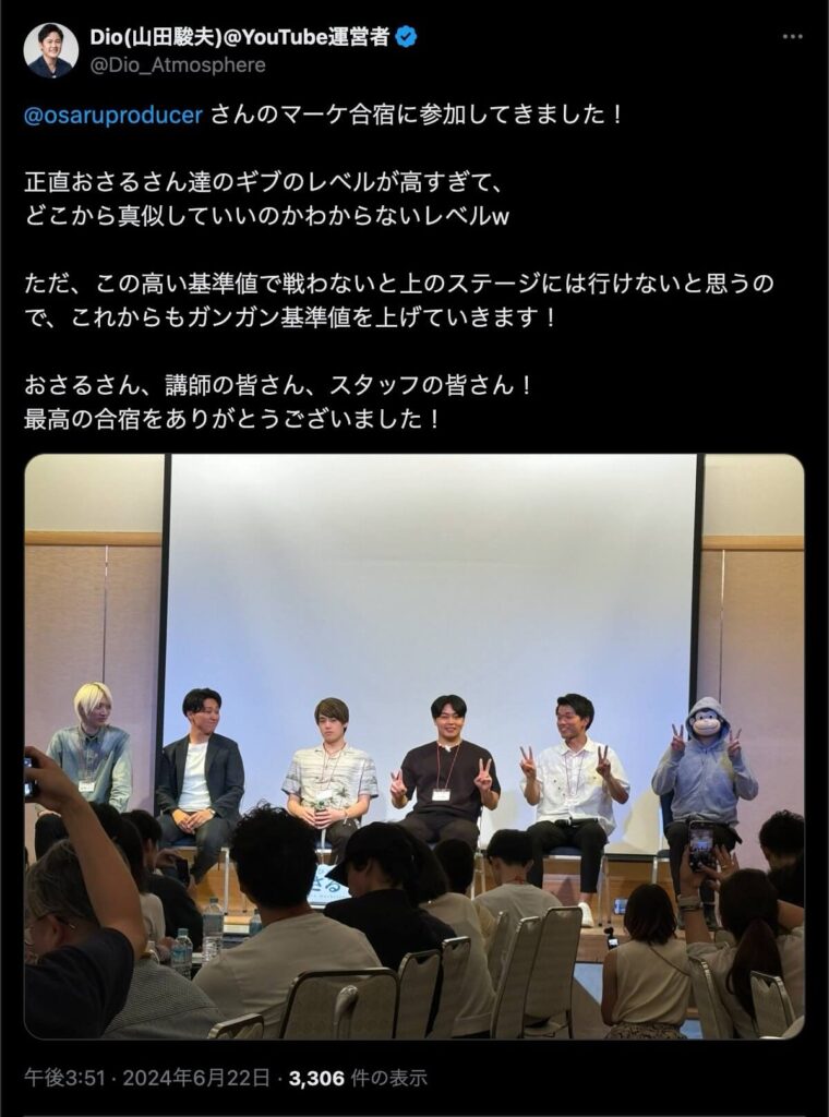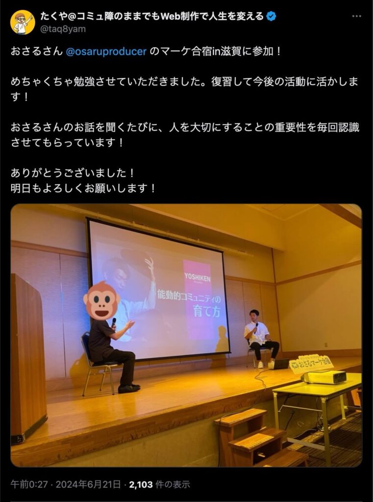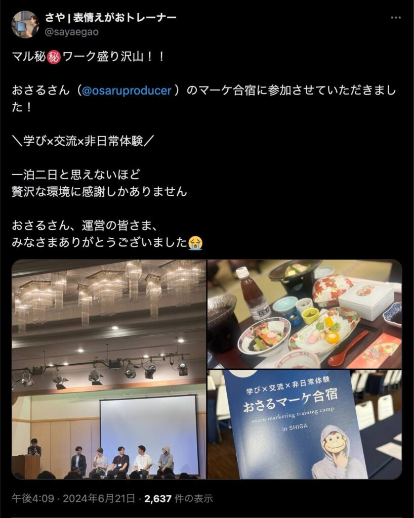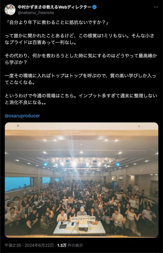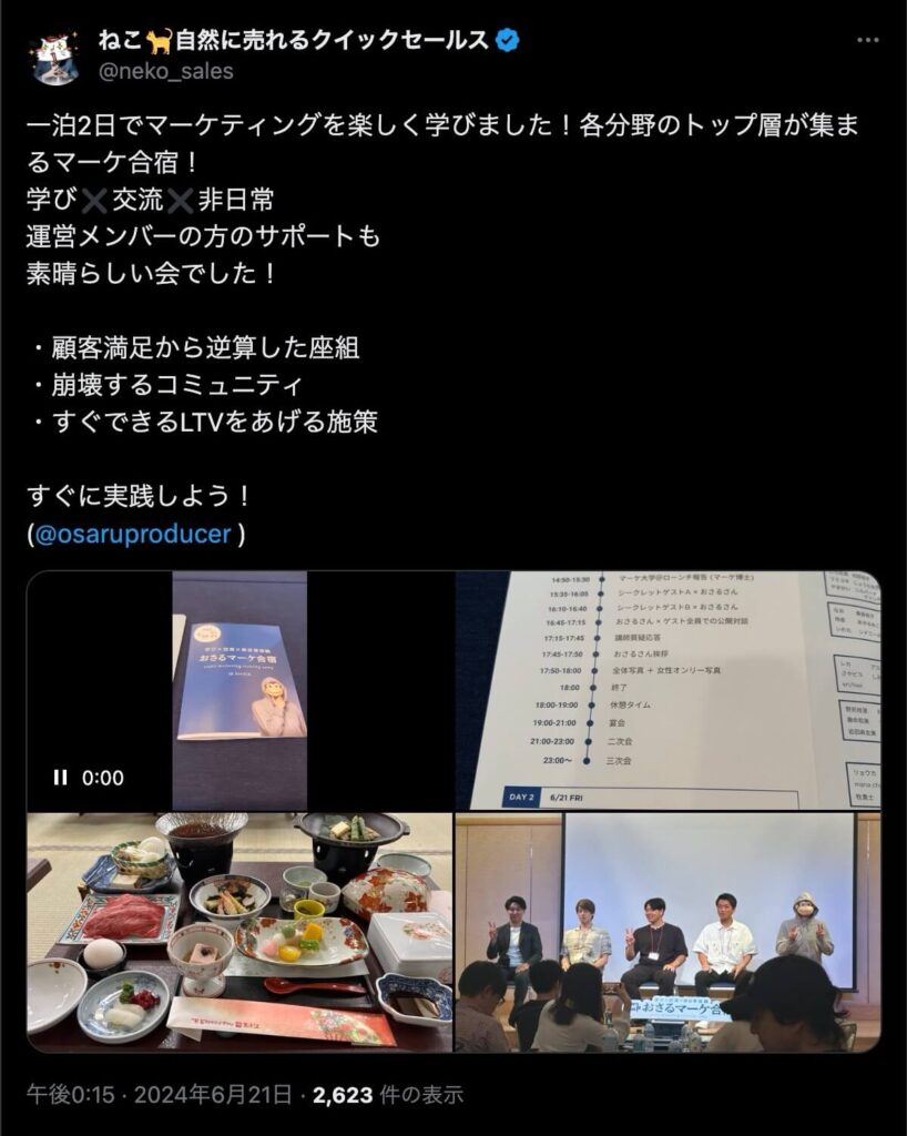 2024年6月20日、総合マーケ講座のおさるマーケ合宿が開催されました。今回も素晴らしい熱量を持った受講生と、運営スタッフによって大成功となりました。