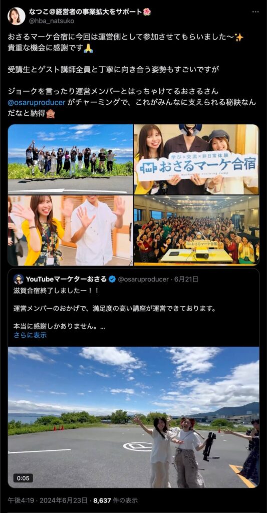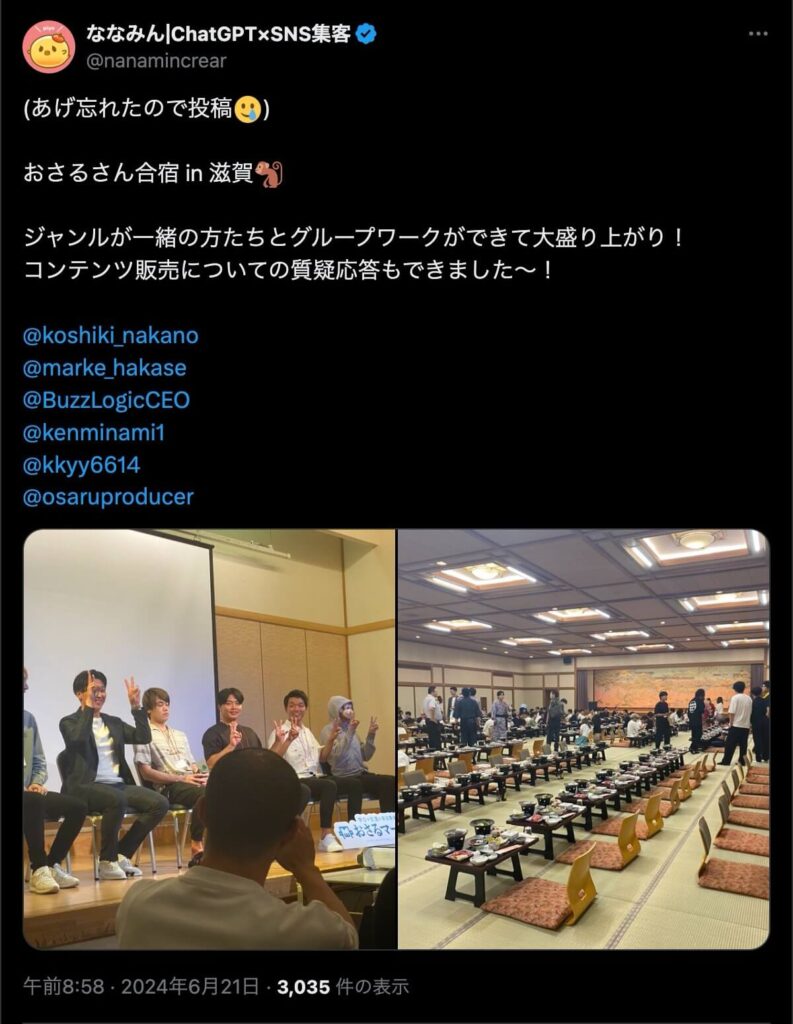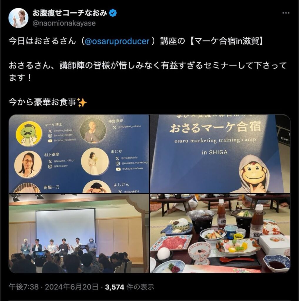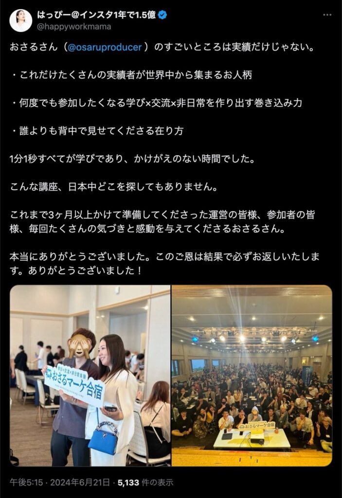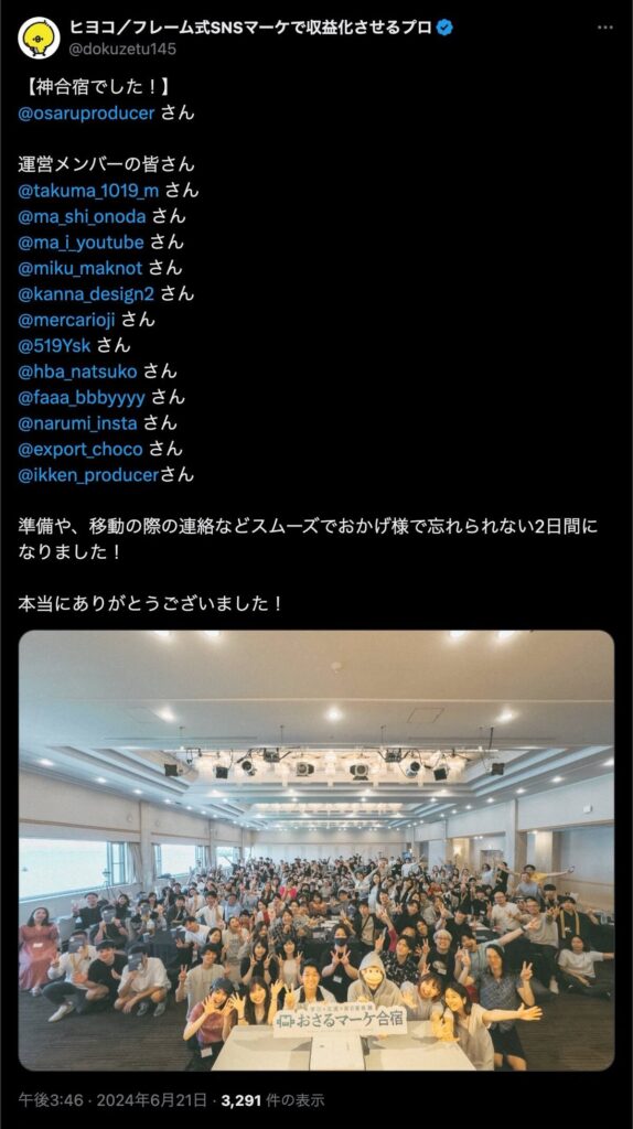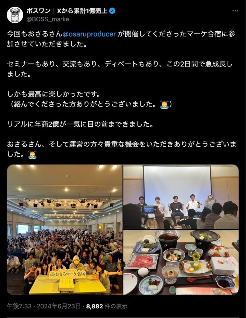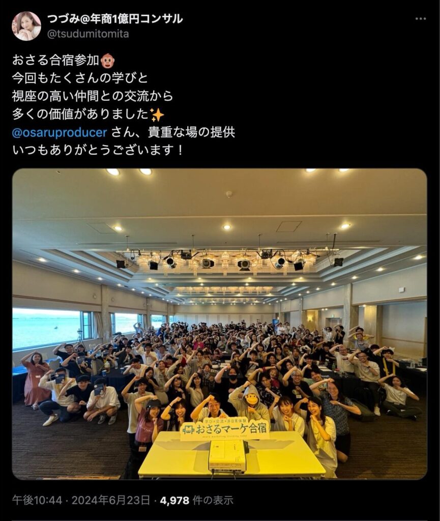 2024年6月20日、総合マーケ講座のおさるマーケ合宿が開催されました。今回も素晴らしい熱量を持った受講生と、運営スタッフによって大成功となりました。