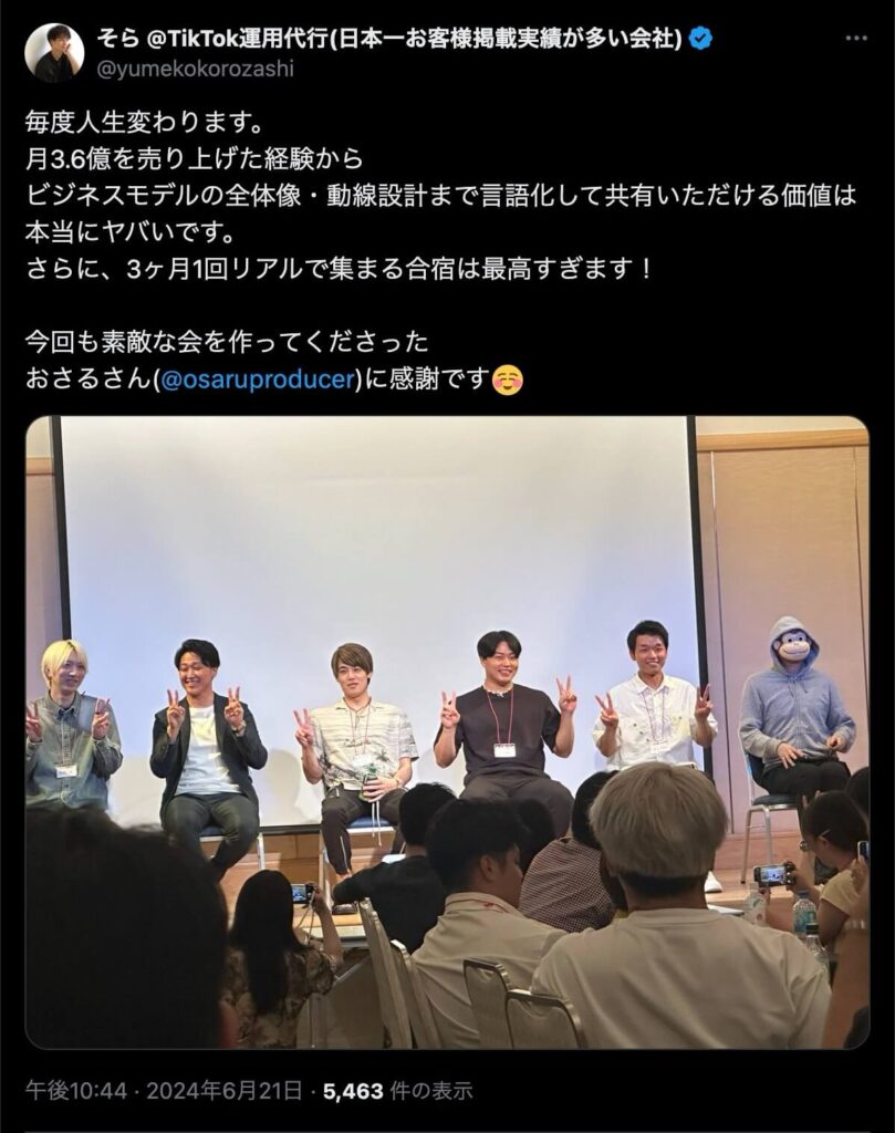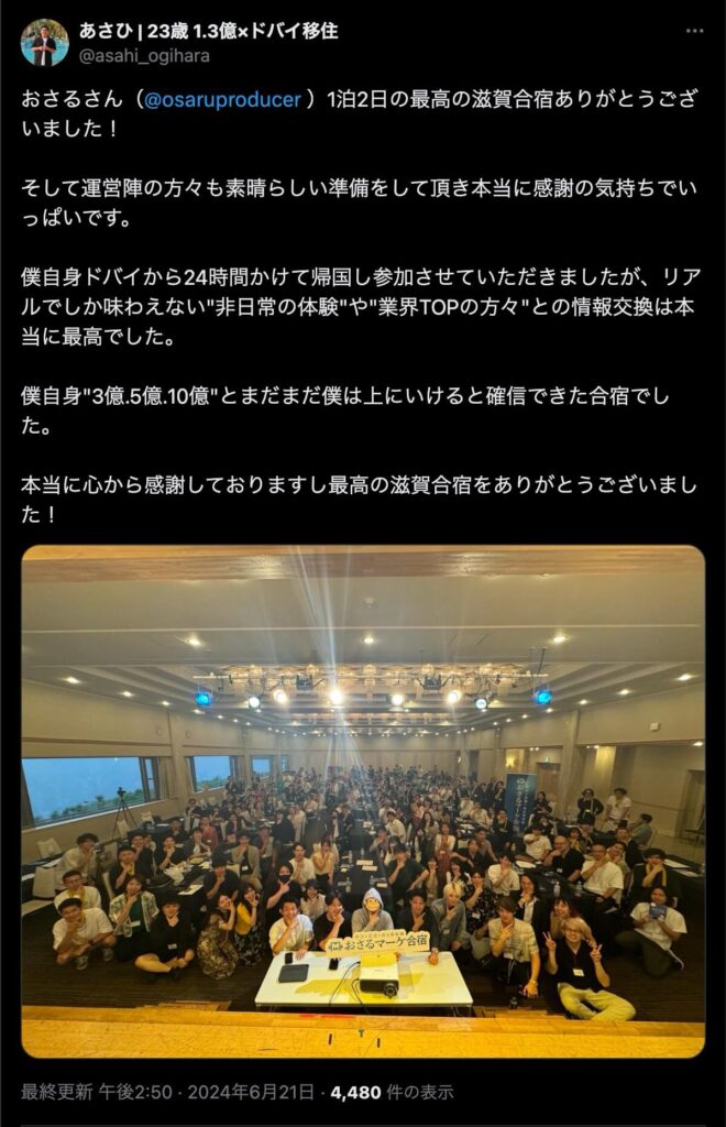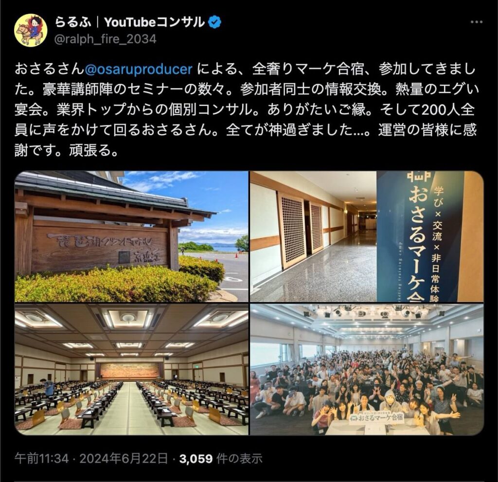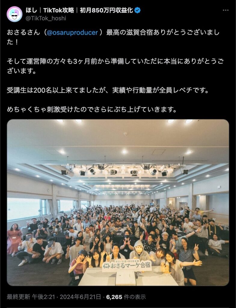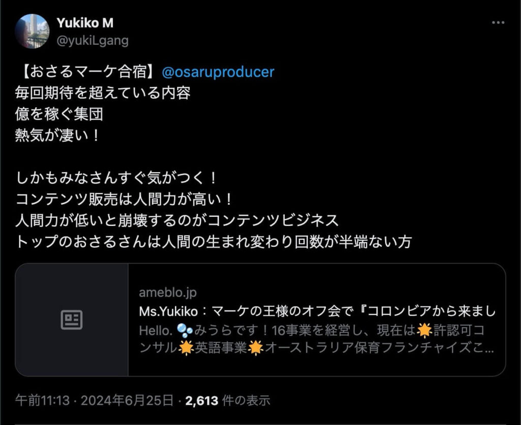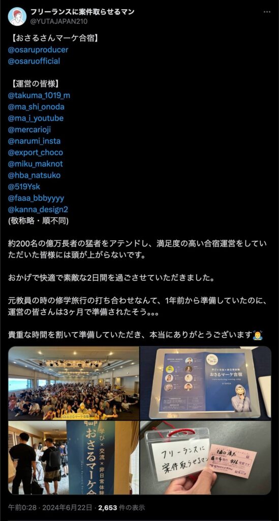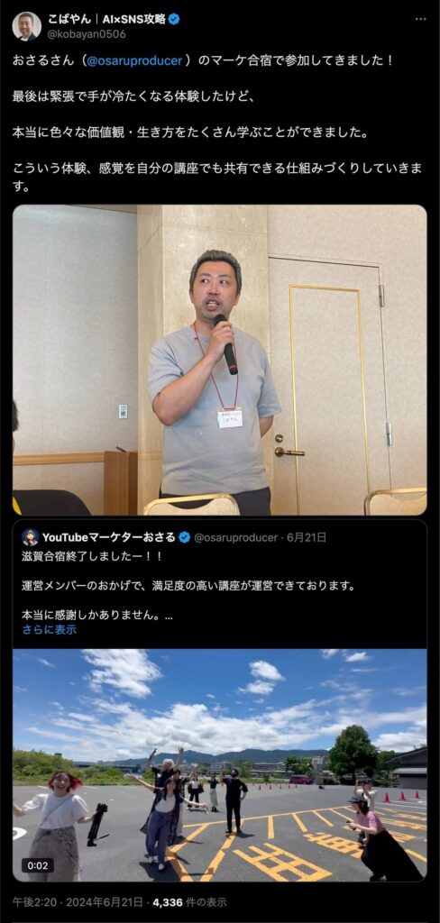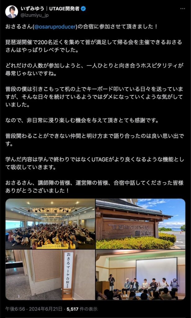 2024年6月20日、総合マーケ講座のおさるマーケ合宿が開催されました。今回も素晴らしい熱量を持った受講生と、運営スタッフによって大成功となりました。